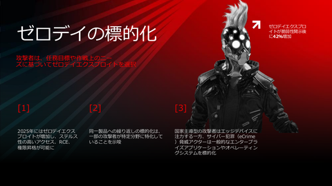 その次は、ゼロデイ脆弱性の利用の増加について。2024年から2025年に42%増加していると林氏は報告。さらに、同一製品に焦点を当てて新たな脆弱性への攻撃を繰り返すグループの行動も紹介した。
