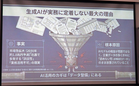 「この技術を発展させ、生成AIに活用できないかというところから開発をスタートした。生成AIの利用は急速に拡大しているが、企業の実務に定着しきれていないのが実態。要因のひとつが、企業内に存在する各種情報資産の連携に課題があることだ。複雑なPDFや図面といったデータに対し、AIがエラーや誤回答を引き起こしている。これはAIの精度が原因ではなく、社内データがAIに読めない形になっていることが根本的な原因だ。つまり、AI活用を左右する大きな要因が、入り口であるデータの整備にある」。