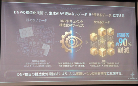 「当社が提供しているサービスは、複雑な図表やツリー図など、AIが読み込むことが難しいと言われている文書を、AIが迷わず完全に理解できるAI-Readyデータへと変換する仕組みになる。このサービスを利用することで、俗に言うハルシネーションを約90%削減し、実用レベルとすることができる」(DNPの金沢常務)。