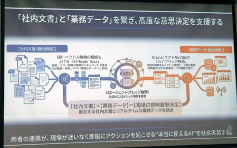 「社内データを生成AIで読み込めるようになっても、企業には情報の分断による手作業発生という課題が残っていた。図面データのような過去のデータ、リアルタイムデータを処理するシステムが別々のシステムであるため、結局、人がそれぞれを検索し、手作業で照合、確認をしなければいけない。そこで起きるタイムラグ、つまりシステム間に横たわる情報の断絶による二度手間・三度手間、これこそが意思決定のスピードを奪っていると当社は考えている。この現場の課題を一掃し、高度な意思決定を支援するのが日本オラクルとの連携となる」(DNPの金沢常務)。