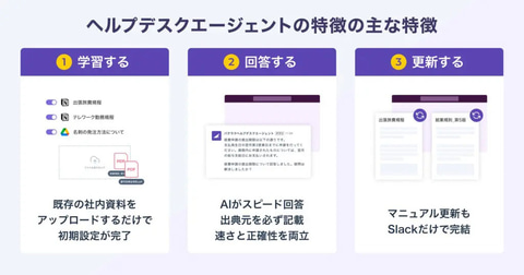 また、AIによる自動回答で解決できない場合は、適切な担当者へシームレスに取り次ぐ仕組みを搭載。問い合わせ対応の進捗や担当者もSlack上で一元管理でき、長期化する問い合わせについても、対応漏れを防止できるとのこと。