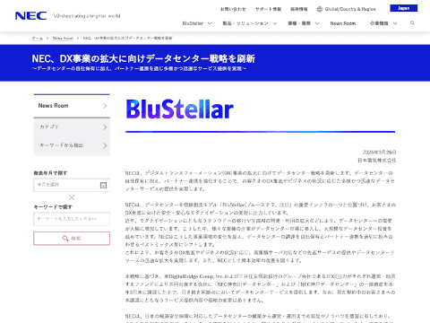 日本電気株式会社(以下、NEC)は26日、デジタルトランスフォーメーション(DX)事業の拡大に向け、データセンター戦略を刷新すると発表した。データセンターの自社保有に加え、パートナー連携を強化することで、顧客のDX推進やビジネスの状況に応じた多様かつ迅速なデータセンターサービスの提供を実現するとしている。