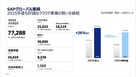 冒頭で鈴木氏は、2025年度の業績を報告。グローバルでクラウドバックログが前年比30%増の772億ユーロに到達したことや、営業利益が104億ユーロ、フリーキャッシュフローが82億ユーロと収益が大幅に向上したことを強調した。また、日本市場でも総売上高が約16億ユーロに達し、クラウドの売上高は36%増と「グローバルの成長率を大きく上回った」としている。