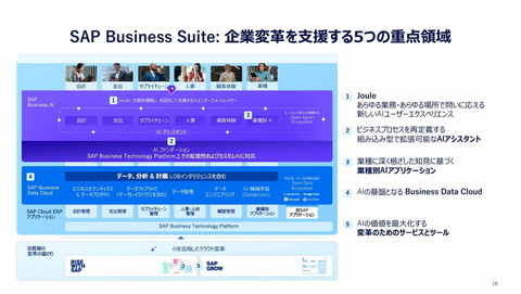 この戦略を推進するにあたり、堀川氏は今年重点的に取り組む5つの領域として、1.AIコパイロットの「Joule」をすべての業務の入り口とすること、2.企業が安心してAIを活用できるよう、データ品質やセキュリティ、ガバナンスを備えた責任あるAIの開発を進めること、3.50年にわたり蓄積してきた25業種の知見をAIエージェントに組み込み、業界特化型の高度なAIアプリケーションを提供すること、4.Business Data Cloudを強化し、AIが活用できる基盤を整備すること、5.日本企業のニーズに応える形で、システム導入や変革プロジェクトの期間短縮を支援するAIツール群を拡充することを挙げた。