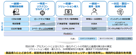 金融庁ガイドラインに対応し、NTTデータグループの実績ある各種ソリューションを最適に組み合わせ、コンサルティングからソリューション導入、運用・監視、継続的改善支援、教育・訓練・テストまでをワンストップで提供する。