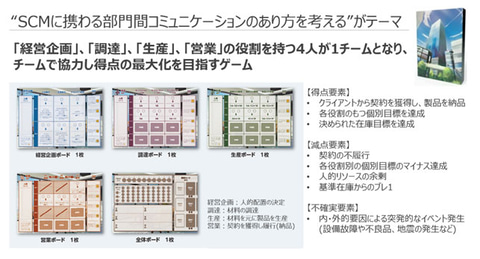 プレイヤーは、突発的な需要変動や供給トラブルなどのイベントに対処しつつ、自部門の成果を最大化できるようにプレイすることになるが、ゲームが進行するにつれ、自部門としては合理的な判断が結果として他部門に悪影響を及ぼし、全体最適を損なう構造が浮き彫りになってくるという。