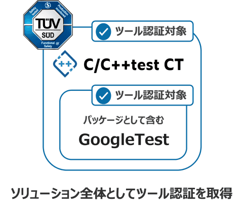 C/C++test CTはGoogleTestをパッケージとして含み、全体のソリューションとして第三者認証機関であるTÜV SÜDからツール認証を取得している。ParasoftがGoogleTestのAPIを一つひとつ検証し、機能安全開発に使用可能な(妥当性が証明されている)APIリストを提供する。APIリストは購入ユーザーに提供されるFunctional Safety Distribution Packageに含まれ、GoogleTestの認証およびAPIの妥当性を証明するエビデンスとなる。これにより、開発者が安心してテストを設計・実装できるよう支援し、安全要求順守を後押しする。