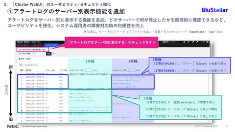 さらに、複数のクラスタシステムを一元管理できるWebアプリケーション「Cluster WebUI」を強化し、アラートログをサーバー別に表示する機能を追加した。従来は、サーバー別のアラートログファイルを出力・収集するためのコマンド「clpalttrace」を用いてCSVで出力する必要があったが、機能強化によって、どのサーバーで何が発生したかを直感的に確認できるようになり、障害対応時におけるシステム運用管理担当者の利便性が向上している。