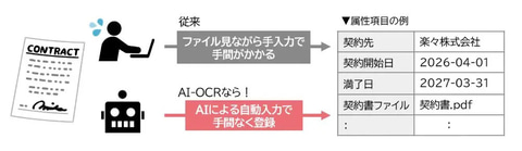 今回の新版では、AI-OCRオプションを新たに提供。既存のOCRエンジンでは認識できなかった手書きの報告資料や帳票類、図面などのテキスト化を実現する。また、利用者がファイルを画面上からアップロードすると、生成AIとAI-OCRによって、ファイルの内容から日付や取引先、金額などの情報を抽出し、文書の属性項目へ自動入力する仕組みを提供する。これにより、手入力作業の工数を削減しながら、検索性を高められるとのこと。