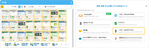授業中には、児童生徒がどんなWebサイトにアクセスしているかを、アイコン表示によってひと目で確認できるほか、一人ひとりが開いているすべてのWebページの詳細も確認可能。また、それらのページの中から共有したいものを選んでほかの児童生徒に転送することもできる。