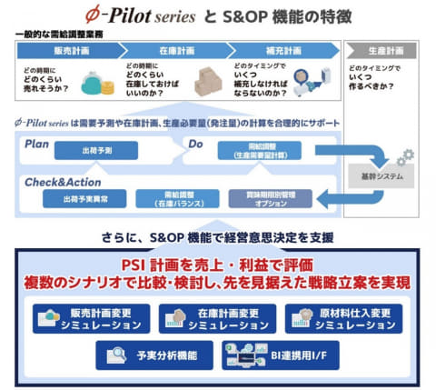今回両社が共同開発したS&OP機能は、Φ-Pilotの需給調整機能に利益目標の達成に向けた視点を取り入れることで、全社最適化された需給計画の立案を支援する。S&OPの中核要素である販売計画、在庫計画、仕入計画を対象に、利益影響を考慮したシミュレーションを可能とし、現場業務の効率化・高度化に加え、経営判断に必要な情報の可視化・最適化を実現する。