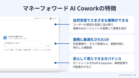 株式会社マネーフォワードは7日、AIが自律的にバックオフィス業務を遂行する新サービス「マネーフォワード AI Cowork」を7月に提供開始すると発表した。バックオフィス業務の遂行に特化したAIエージェントサービスで、「マネーフォワード クラウド」のラインアップの1つとして提供され、マネーフォワード クラウドとの連携が標準設定される。ユーザーはMCPサーバー導入や運用・保守等が一切不要で、専門知識がなくても利用できるという。