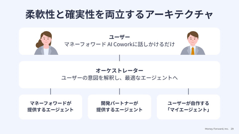また、オーケストレーターが扱うAIエージェントは、マネーフォワードが用意したものに加え、外部のパートナー企業が開発したもの、ユーザー自身が開発した「マイエージェント」を組み合わせて利用できるようになっており、さまざまなAIエージェントが業務を遂行するオープンな設計を取り入れている。