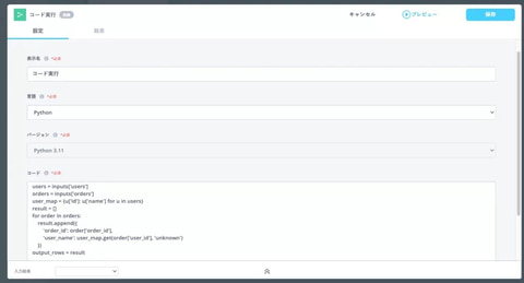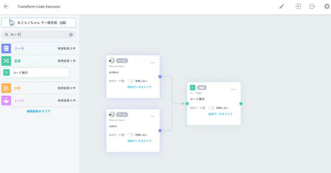 今回はそのデータ連携フロー内で、PythonおよびJavaScriptによるカスタム処理を記述・実行できる「コード実行機能」を新たに搭載した。これにより、複雑な条件分岐やロジック処理など、ノーコードでは対応しにくい処理をコードで実装できるとのこと。