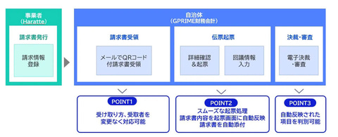 今回の連携では、Haratteで作成・受領された請求書データに基づき、GPRIME財務会計内の支出命令書や支出負担行為兼命令書を作成する際の入力情報を自動転記できるようになった。手入力作業を最小化することで、入力ミスによる差し戻しを防止するほか、自治体職員の事務負担を軽減し、支払いまでの審査プロセスが迅速化も図れるという。