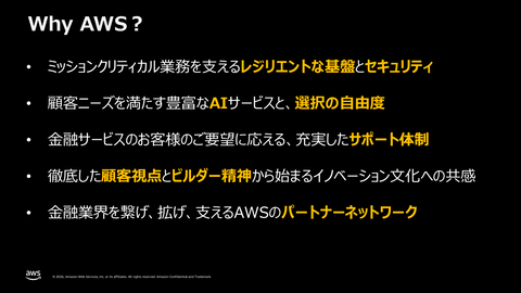 最後に、ここまでの内容から、金融業界でAWSが使われている理由について鶴田氏はまとめた。足元のレジリエントな基盤とセキュリティ、AIサービスの選択の自由、サポート体制、イノベーション文化を挙げ、それをパートナーとともに展開して、今後のビジネスをさらに拡大していきたいと語った。