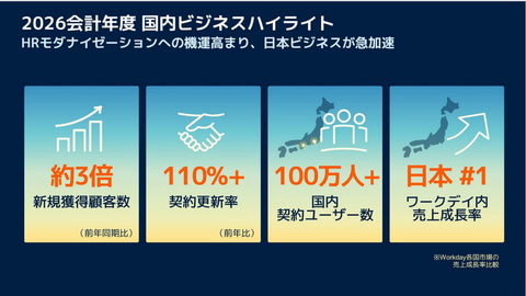 これは、同社がHRモダナイゼーションの本格展開に向けて実施したさまざまな取り組みの成果といえる。古市氏は、2026年度の実績として、「HRモダナイゼーションのアドバイザリーサービスを開始し、30社以上、のべ50サービス以上の人事戦略を支援した。また、国内データセンターを開設し、金融機関など国内でのデータ保持を重視する顧客ニーズに対応した。製品面でも、日本特有の4月の大規模人事異動への対応や、領収書OCRの精度向上など、日本市場の個別要件を反映した機能をリリースした」と述べている。