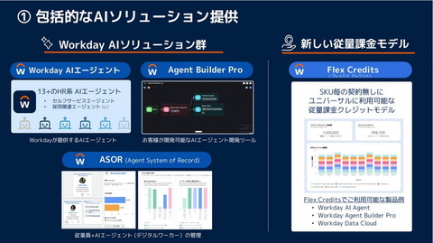 包括的なAIソリューションについては、すでに13以上のHR系AIエージェントを提供しているほか、自らAIエージェントを構築したい顧客に向けてはローコード・ノーコードでエージェントが作成可能なエージェント開発ツールを提供している。また、今年3月には企業内のAIエージェントの可視化と統治・管理・最適化が可能な「Agent System of Record(ASOR)」も提供開始した。
