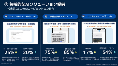 古市氏は、ワークデイが提供している代表的なAIエージェントとして、HR部門に代わって従業員からの問い合わせに回答する「セルフサービスエージェント」、大量採用の面接スケジュールを自動化する「候補者体験エージェント」、採用候補者の選定を効率化する「リクルーターエージェント」を紹介した。「セルフサービスエージェントではHR部門への問い合わせ件数が25%削減できるほか、リクルーターエージェントでは採用時間が17%削減できる」と古市氏は説明する。