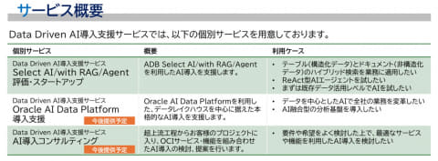 Data Driven AI導入支援サービスは、新規、既存を問わず、顧客がさまざまなデータを生かした価値のあるAIシステムを導入できるよう、適切なOCIの各サービスやOracle AI Databaseの機能を組み合わせたAIシステムの導入を支援する。顧客は、自社のAIシステム導入に対する目的やそのビジョン、規模などに応じた個別サービスを選択して利用できる。