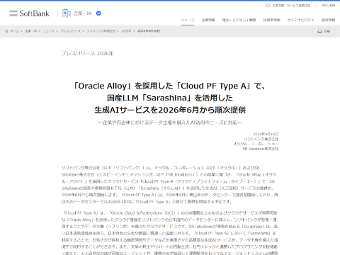 ソフトバンク株式会社は16日、米Oracle(以下、オラクル)およびSB Intuitions株式会社との協業に基づき、「Oracle Alloy」を採用したクラウドサービス「Cloud PF Type A」で、SB Intuitionsの国産大規模言語モデル(LLM)「Sarashina」を活用した生成AIサービスを、6月から順次提供開始すると発表した。