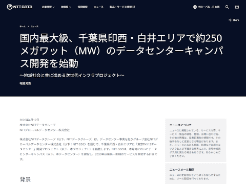 株式会社NTTデータグループは17日、データセンター事業を担うグループ会社のNTTグローバルデータセンター株式会社(以下、NTT GDC)を通じて、千葉県印西・白井エリアに「東京TKY12データセンター」開発プロジェクトを始動すると発表した。NTT GDCは同用地にデータセンターキャンパスを建設し、2030年以降に第一期棟のサービスを開始する計画としている。