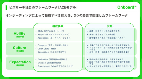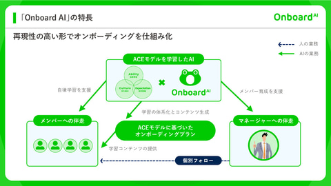 Onboard AIは、学際情報学を研究する立教大学経営学部 田中聡准教授の協力のもと、開発したフレームワーク「ACEモデル」をベースに、Ability(技術学習)、Culture(文化適応)、Expectation(役割理解)を進める。