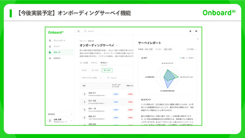「通常業務で忙しいマネージャー層が、Onboard AIを使うことで教育や育成にかける時間を最適化し、それまでは難しかった大規模マネジメントを行える世界を実現していきたい。将来的にはオンボーディングデータを採用活動に活用することや、社内の異動や配置に適用していく世界を実現したい」(茂野氏)。