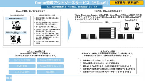 Domo管理アウトソースサービス「MDaaS:Major Domo as a Service」は、パートナー企業より派遣されたDomoの認定資格上級者(UCP資格保有者)が顧客に代わり、Domoを適切に管理し、社内浸透させ、持続的な運用をする。MDaaSが、ガバナンス支援、PMO支援、Domo運用などを代行することで、現場の作業負担を軽減する。これにより、顧客は本来注力すべきデータ活用に集中でき、組織の自立・自走をより加速できるとしている。
