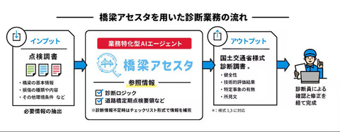 「橋梁アセスタ」は、橋梁の点検票をインプットすると、国土交通省が定める制度・要領等に準拠した様式で診断調書案を自動生成する業務特化型AIエージェント。従来のRAGのようにマニュアルを検索するだけでなく、熟練技術者の暗黙知を言語化した独自の「診断ロジック」を参照情報として組み込んでおり、点検票から必要な情報を自動で抽出して、診断調書案(定量評価)を生成できる。これにより、高度な専門知識と経験が求められる橋梁点検・診断業務における技術者不足などの課題を解決し、診断品質の均質化を実現するという。