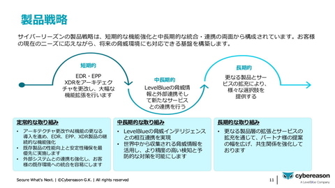 LevelBlue統合後の製品戦略としては、「短期的な機能強化と中長期的な統合・連携の両面から展開し、顧客の現在のニーズに応えながら、将来の脅威環境にも対応できる基盤を構築していく。短期的な取り組みでは、EDR・EPP・XDR製品のアーキテクチャを更改し、大幅な機能拡張を行う。中長期的な取り組みでは、LevelBlueの脅威インテリジェンスとの相互連携や新たなサービスとの連携を行うことで、より精度の高い検知と予防的な対策を可能にする。長期的には、さらなる製品層の拡張とサービスの拡充を通じて、パートナーの提案の幅を広げ、共生関係を強化していく」との方針を発表した。
