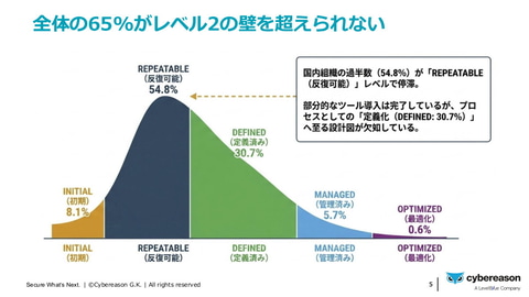 「調査の結果から、国内組織の過半数(54.8%)がレベル2の『REPEATABLE(反復可能)』で停滞していることがわかった。部分的なツール導入は完了しているが、プロセスとしてレベル3の『DEFINED(定義済み)』へ至る設計図が欠如しており、全体の65%がレベル2の壁を越えられない実態が浮き彫りになった。業種別では、金融・製造業は、防御・検知は強固だが、『何を守るべきか』を見失っている。建設・インフラ業は、異常を察知する能力は高いが、生き残るための『止血帯』(復旧手順)が欠落している」と、サイバーセキュリティ成熟度の実態を分析。