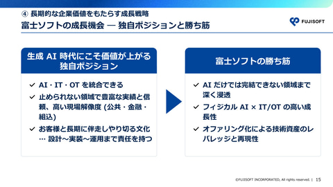 こうした経営体制を変えていくとともに、富士ソフトの強みとして、AIに加え、もともとの強みであるIT、OTを統合して提供する。室岡社長は、「これができる企業は、日本では数少ない」と述べ、これまで培った強みだとアピール。さらに、「フィジカルAIのように、AI技術だけでは完結できないものについては、ITとOTを組み合わせて提供できることが強みとなってくる。さらに、オファリング化による技術資産のレバレッジと再現性を高めていく」とした。
