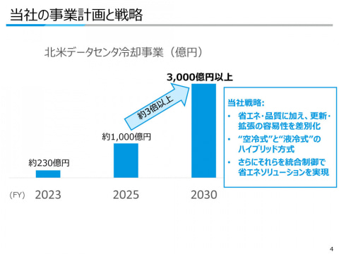 「北米市場を最優先する方針であり、GAFAMのすべてに納入することを目指す。一方で、日本国内では都市型データセンターが増加すると見ており、既存データセンターを、AIデータセンターにリノベーションする動きが期待される。DDCソリューションズなどの買収した企業の製品を通じて、国内のデータセンター市場にも打って出ることができる」としている。