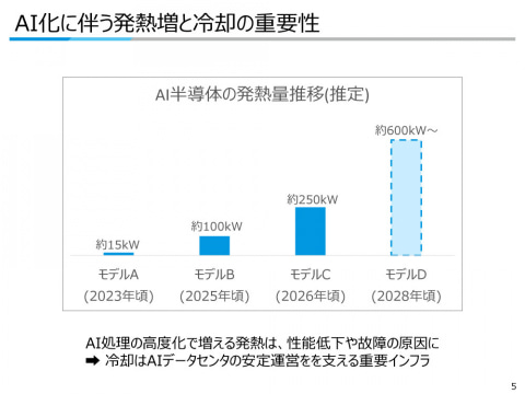 北米におけるデータセンター向け冷却市場は、2025年に約1兆1000億円規模であるのに対して、2030年には約2.5倍の約2兆7000億円に拡大すると見込まれている。クラウドサービスの拡大、データ量の急増によるデータセンター新設の増加とともに、AIサーバーでの熱処理負荷が増大し、冷却に対する重要性が高まっていることが背景にある。同社の試算によると、2022年には1ラックあたりの消費電力は約15kWであったものが、2025年には約100kWに、2026年には約250kWになるとし、さらに2028年には600kW以上になると見ている。