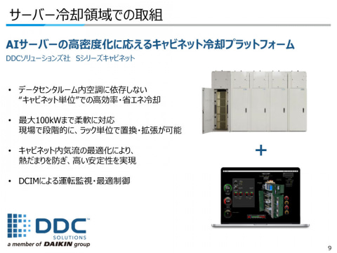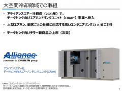 「品質や省エネ性の差別化に加えて、3~5年での短期周期で行われるサーバーラックの更新、拡張の容易性を差別化できる製品群をそろえている。また、空冷式と液冷式をフルラインアップで取りそろえ、ハイブリッド方式での冷却能力を提供できる点も強みになる。さらに、それらを統合制御するシステムを開発し、パッケージとして提供することで、圧倒的な省エネソリューションを実現できる」とし、「買収企業との協業を通じて、それぞれの技術や知見を、ダイキンの開発力、生産力と組み合わせることで、差別化された冷却機器を市場投入できる」とも説明している。