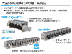 高集積地向けに容量を拡大した業界トップクラスの大容量磁気軸受チラーである「WME-C Quadチラー」のほか、従来のAWVチラーを高外気対応へ改良したり、高外気向け磁気軸受空冷チラーを新たに投入したりといった取り組みを行っている。