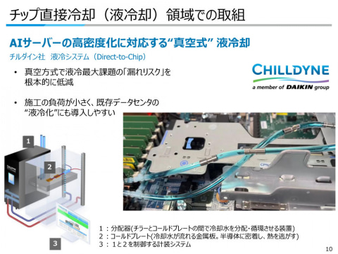 3つめの「チップ直接冷却」では、2025年11月にチルダイン買収。同社が持つ真空式液冷システムにより、AIサーバーの高発熱に対応する液冷ソリューションを展開するという。