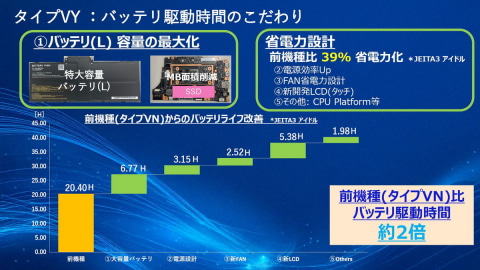 具体的には、バッテリーの大容量化で6.77時間、電源設計で3.15時間、新たなファンの採用で2.52時間、高輝度/低電力の新開発LCDの採用で5.38時間の改善を果たしたという。