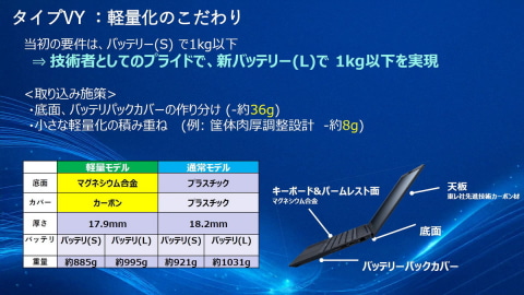 軽量化にもこだわった。当初は、バッテリー(S)において1kg以下の重量を想定していたが、技術者の努力によってバッテリー(L)でも1kg以下の軽量化を実現。「軽量モデルでは、底面にマグネシウム合金を使用。バッテリーパックカバーをカーボンにするといった作り分けを行った。小さな工夫や改善の積み重ねも軽量化につながっている」という。