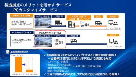 導入時に提供する「PCカスタマイズサービス」では、PCの生産拠点である山形県米沢市のNEC PC米沢事業場を活用して行うため、あらかじめキッティングしたPCを工場から直送。販売店などを通じて2次配送に伴う配送コストを削減できる。また、キッティングにかける工数を大幅に削減できるため、IT部門における人員不足という課題にも対応可能だ。