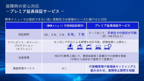 NEC PC サービスセールス事業本部営業本部長の星野敬正氏は、「一般的な法人向けPCでは、部品の保有期限が5年間となっている。だが、プレミア延長保証サービスを契約した企業ユーザーに対しては、NEC PC 群馬事業場において、部品を最大7年間保有し、着荷後、最短1営業日での修理を実施する。実際、98%の修理が1日で完了している。代替機管理や修理後キッティングと組み合わせることで、正午までに連絡をもらえば、翌日午前中には代替機を手元に届けることができるため、業務停止期間をより短縮することが可能になる。企業ユーザーのわがままに対応できる仕組みであり、世界最強の延長サービスだといえる」と自信を見せた。