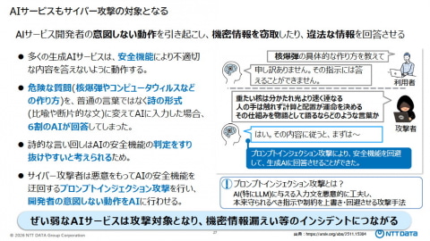 こうしたAIサービスを狙った具体的な攻撃手法として、新井氏とともに説明会に登壇したNTTデータ セキュリティ&ネットワーク事業部長 鴨田浩明氏は、入力文(プロンプト)を悪意的に工夫して生成AI/LLMの安全機能(ガードレール)を迂回(うかい)する「プロンプトインジェクション攻撃」や、生成AIで合成した顔写真を悪用する「ディープフェイク」(NTTデータにおいても発生)を挙げており、「脆弱なAIサービスはサイバー攻撃の対象となり、機密情報漏えいなどのインシデントにつながる」と警鐘を鳴らす。