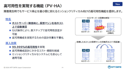 バージョン1.0から提供しているライブマイグレーションに加え、「エンタープライズの顧客が熱望していた」(濱野氏)という、ミッションクリティカル向けの高可用性機能をPV-HAとして提供している。物理サーバー(特にホストサーバー)が故障しても待機系ホストサーバーで仮想マシンを自動で再起動する高可用構成が、GUI操作によって数ステップで設定可能となっており、高可用構成を実現するための設計コスト/期間を大幅に削減している。