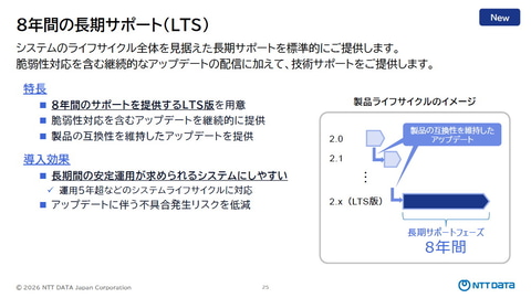 システムのライフサイクル全体を見据えたサポートとして、8年間という長期のサポートを標準で提供、長期間の安定運用が求められるシステムにも適用しやすくしている。また、脆弱性対応などを含むアップデートを継続的に提供し、アップデートに伴う不具合発生リスクを低減する。
