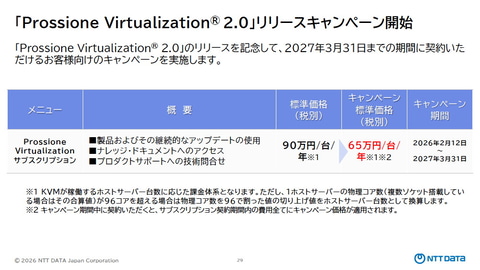 Prossione Virtualization 2.0の標準価格は1サーバーあたり年間90万円だが、「できるだけ速くこの製品を市場に浸透させたい」(新谷氏)ことから、2026年2月12日から2027年3月31日までをキャンペーン期間とし、期間中は1台あたり年間65万円のキャンペーン価格で提供される。