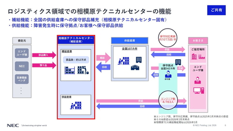 「補給機能」は、2026年5月から開始する機能であり、集中倉庫と位置づける全国10カ所のパーツセンター、中規模倉庫とする全国51カ所のパーツブランチに保守部品を供給し、部品在庫を補充することになる。1日1700件を出荷するという。保守部品を供給するパーツセンターやパーツブランチからは、修理を行う顧客企業のもとにパーツを配送したり、全国309カ所の保守拠点や、45カ所の拠点機材倉庫などを通じて、顧客企業のもとに保守部品を配送したりすることになる。これまで川崎テクニカルセンターで行っていた補給機能も、今後は相模原テクニカルセンターに統合する計画だ。
