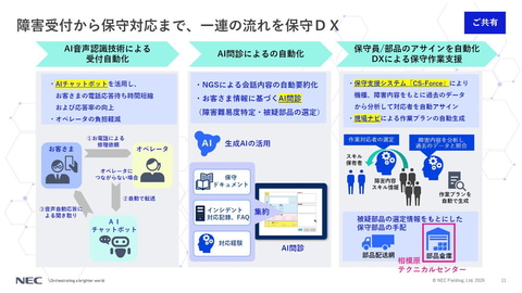 例えば、コールセンターにおける修理の受付業務では、AI音声認識技術を活用して、電話応答の待ち時間を短縮したり、AI問診では、NEC Generative AI Service(NGS)を活用した会話内容の自動要約を行い、障害の難易度の特定や被疑部品の選定につなげたり、SalesforceのService CloudおよびField Serviceを活用した保守支援システム「CS-Force」により、障害内容と過去のデータを照らし合わせ、最適な対応者を自動アサインするとともに、現場ナビを活用した作業プランの自動生成も行っている。