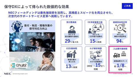 2017年からは、社内DX化を推進。NECが持つAIや量子コンピュータなどの最新技術を、社内システムに実装しているのも特徴だ。2022年9月には、NECの疑似量子アニーリング技術を用いて、保守部品の配送計画立案システムを稼働。熟練者が2時間かけていた保守部品の翌日配送計画の立案作業を、10分の1となる12分に短縮するなどの成果を上げている。