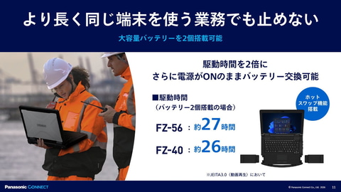 マイナス10℃~50℃までの広範な動作温度に対応しているほか、大容量バッテリーで約13時間の稼働時間を持ち、セカンドバッテリー装着時には、最大約26時間の利用が可能だ。FZ-56と同様にホットスワップにも対応している。